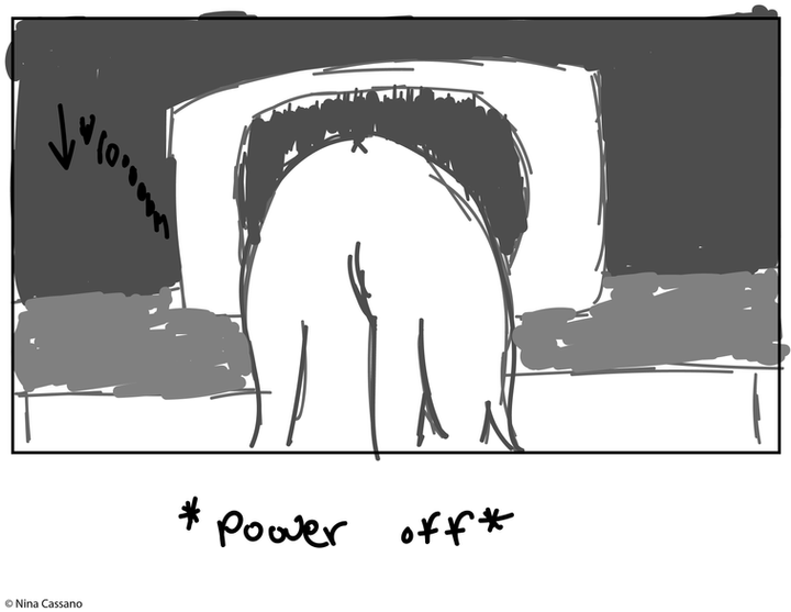 The goal for this storyboard was to create a scene for the middle of an episode. When looking through this, keep in mind the audience does not know what took place before this scene and what happens after. Why is there a brief pause between their hostile argument and an awkward glance away? That is up to your imagination!
